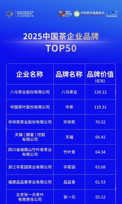 (八马茶业荣膺由中国茶叶流通协会、新华社中国经济信息社共同评选的“2025中国茶企业品牌调查结果TOP50”第一名)